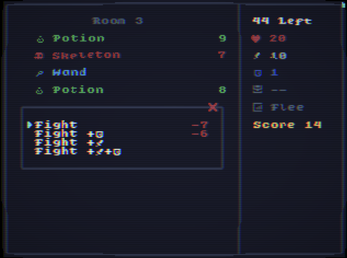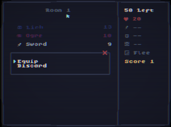 Inspired by the solitaire card game Scoundrel (by Zach Gage and Kurt Bieg), with new enemy types, equipment, and mechanics. This game is still in development.
