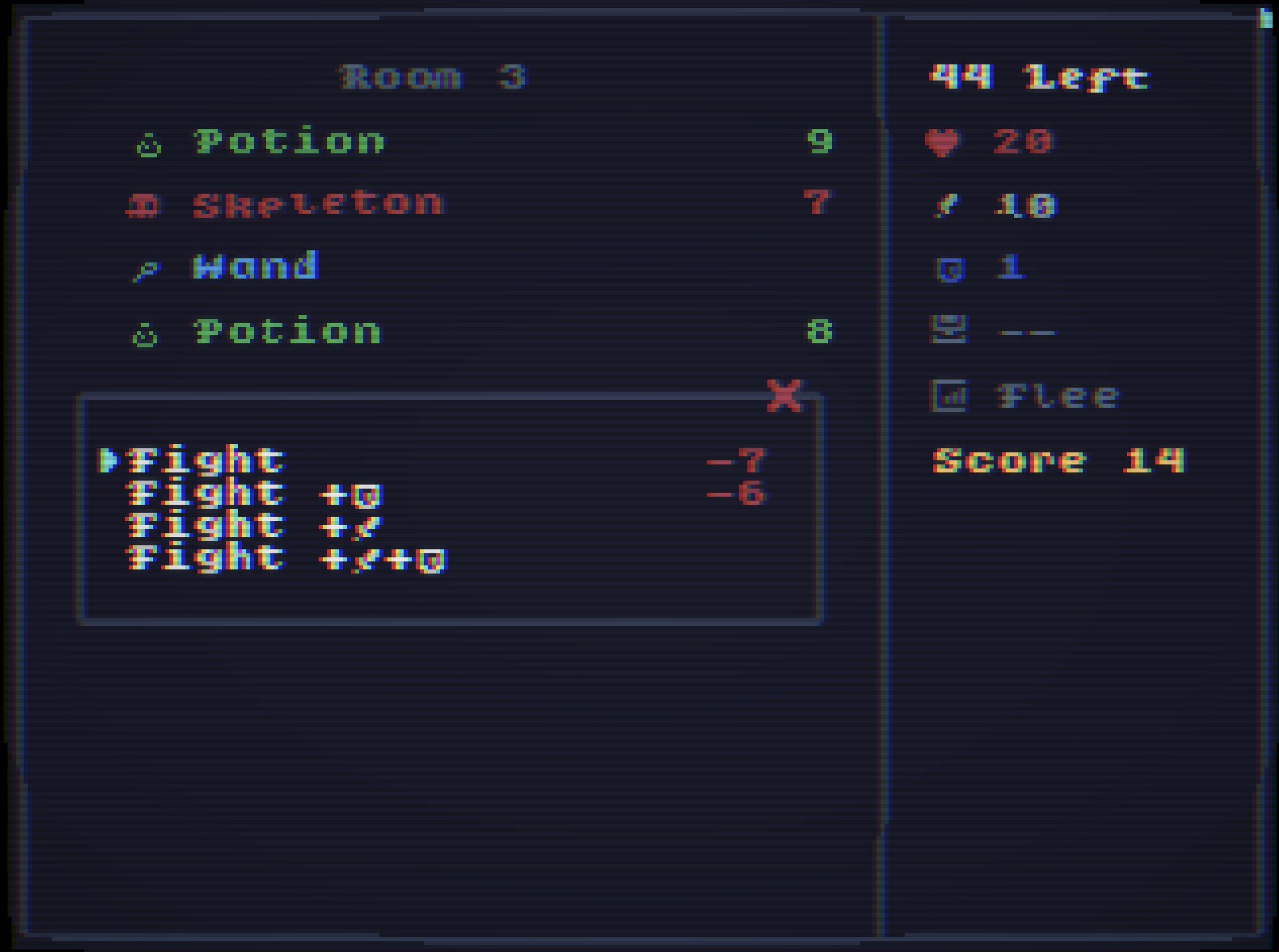 Every room is a puzzle: fight the ogre bare-handed or burn your best weapon? Store the shield or drink the potion? Leave the dragon lingering and eat another d6 of fire next room? Trade your blade to the merchant for a heal you desperately need?
